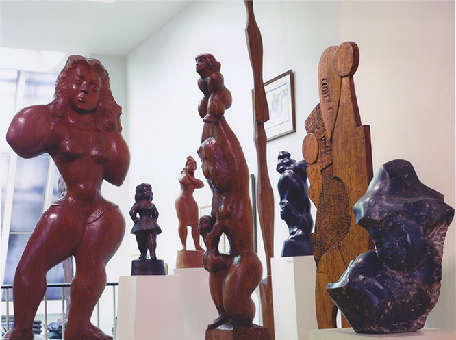 The first-floor gallery at the Renee & Chaim Gross Foundation in New York features an array of sculptures by Chaim Gross (1904– 1991). From left, in the foreground: Victoria (1951), Twins (1943), Roosevelt and Hoover in a Fistfight (1932), and Naomi and Ruth (1956). Photograph courtesy of Sotheby’s.
