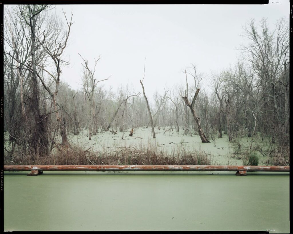 Even in more painterly photographs—or those whose composition and messaging is tightly controlled—it’s possible to track the tendency of the world to intrude in unexpected ways. Consider Richard Misrach’s Swamp and Pipeline, Geismar, Louisiana, from his Cancer Alley project, commissioned in the ’90s as part of the High’s “Picturing the South” initiative. The photographer’s straightforward framing of his landscape, and the careful chromatic ranging of mints, whites, and straw yellows, are elements of the picture that we might have associated with painting. The forest of bleached trunks recalls an early Thomas Cole tour de force, Lake with Dead Trees (Catskill) (1825), although the works’ receptions likely differ. Within the Cole painting’s sublime totality, viewers may fail to notice a subtext that we could call environmentalist. Conversely, in Misrach’s photograph, the rusty pipe in the middle ground would seem to be the key detail. The miraculous algae bloom, which has transubstantiated poisoned standing water into what looks like solid ground, becomes merely a gloomy backdrop, a sort of pathetic fallacy to amplify the dire warning of the picture.