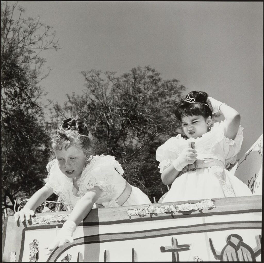 This, some would say, is teaching the camera how to lie, but under a gentle hand it remains a startling vehicle for truth-telling, even if the truths being told are often nebulous. A youngster takes it easy in Mark Steinmetz’s Girl on Car, Athens, GA of 1996, her face as impassive, and yet as magnetic and mysterious, as that of an Ingmar Bergman heroine. Lost in youthful pensiveness, her eyes reflect what we cannot see, and entreat us to follow her there. In an image by Rosalind Fox Solomon, a pair of Mardi Gras princesses, bejeweled and coiffed, in gloves and white gowns, are silhouetted against a cloudless sky and budding trees. It isn’t a commercial shot. One girl bends over the edge of the float to stretch out her fingers for something; the other observes the exchange, adjusting her tiara and squinting in the sun. With the seriousness of children, both girls transcend their simple role in the pageant by unexpected displays of personality. “The depth is in the pictures, not what I say about them,” Solomon has remarked, acknowledging her own limited understanding of what the camera had wrought.