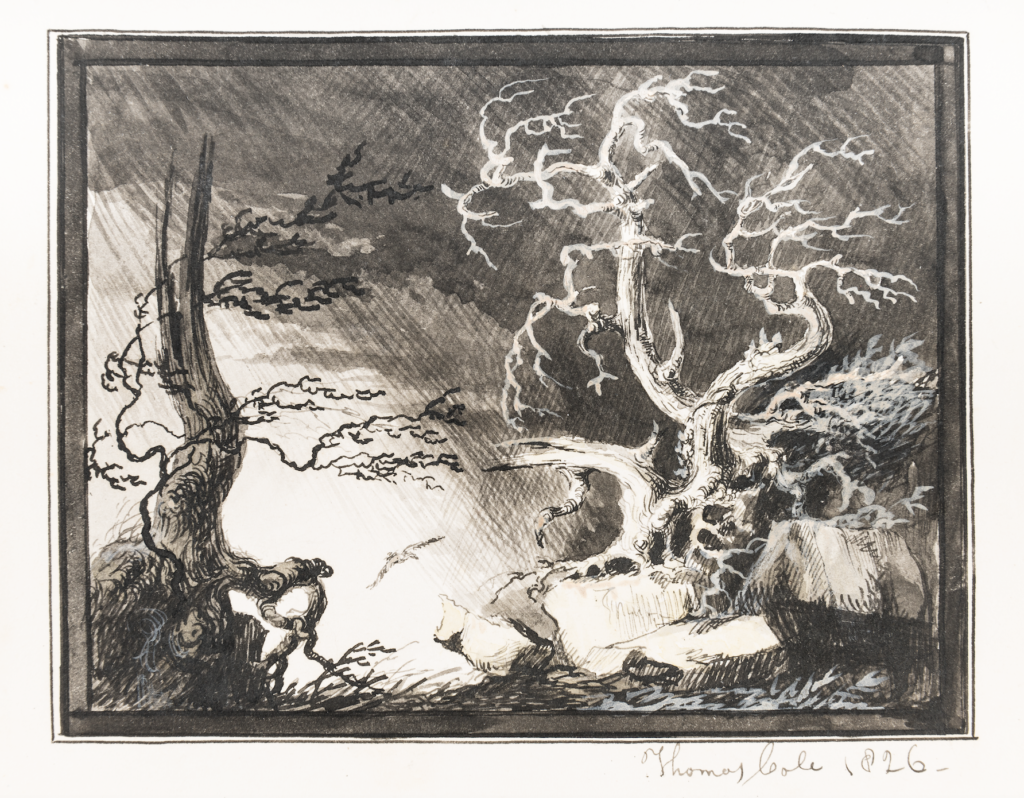 Quoting from Cole’s letter, Dunlap wrote of the artist’s work in the frontier territory of Ohio: “He now began in 1823, to make studies from nature . . . . He made small, but accurate studies of single objects; a tree, a leafless bough—every ramification and twig was studied, and as the season advanced he studied the foliage, clothed his naked trees, and by degrees attempted extensive scenes.”