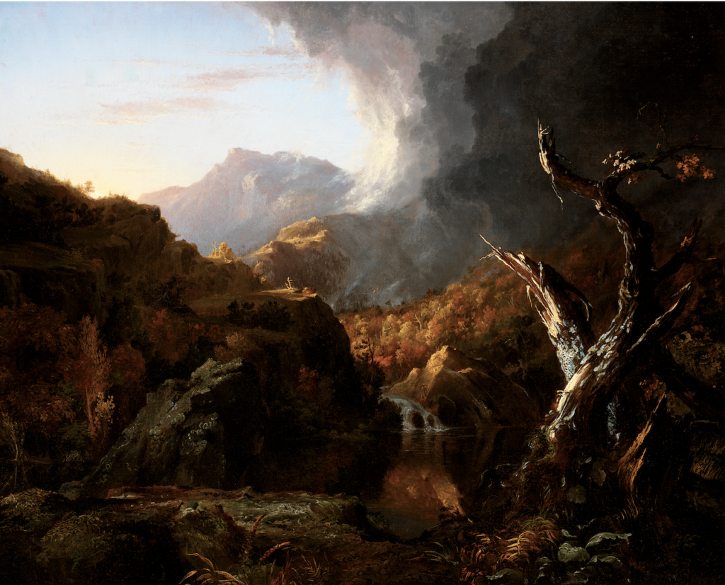 Cole’s painting is less than half the size of the “Rosa,” but the two pictures are clearly similar in composition and share unique details, such as the storm-blasted tree trunks in the foreground and the distant mountain peaks. But there are important differences. The young Cole, seeking to connect himself with the tradition of sublime landscape painting, yet desiring to appear individual enough to be considered a new talent, created an understated variation. For one thing he does not include the figures of Mercury, Argus, or the cow—perhaps because drawing the human figure was never his gift (8); by eliminating them he evoked the solitude of the American wilderness that he had recently experienced in his wanderings in Ohio and Pennsylvania. Moreover, by removing signs of domesticity, he produced something unfamiliar to his audience, a painting without mythological significance, narrative, or topographical references.